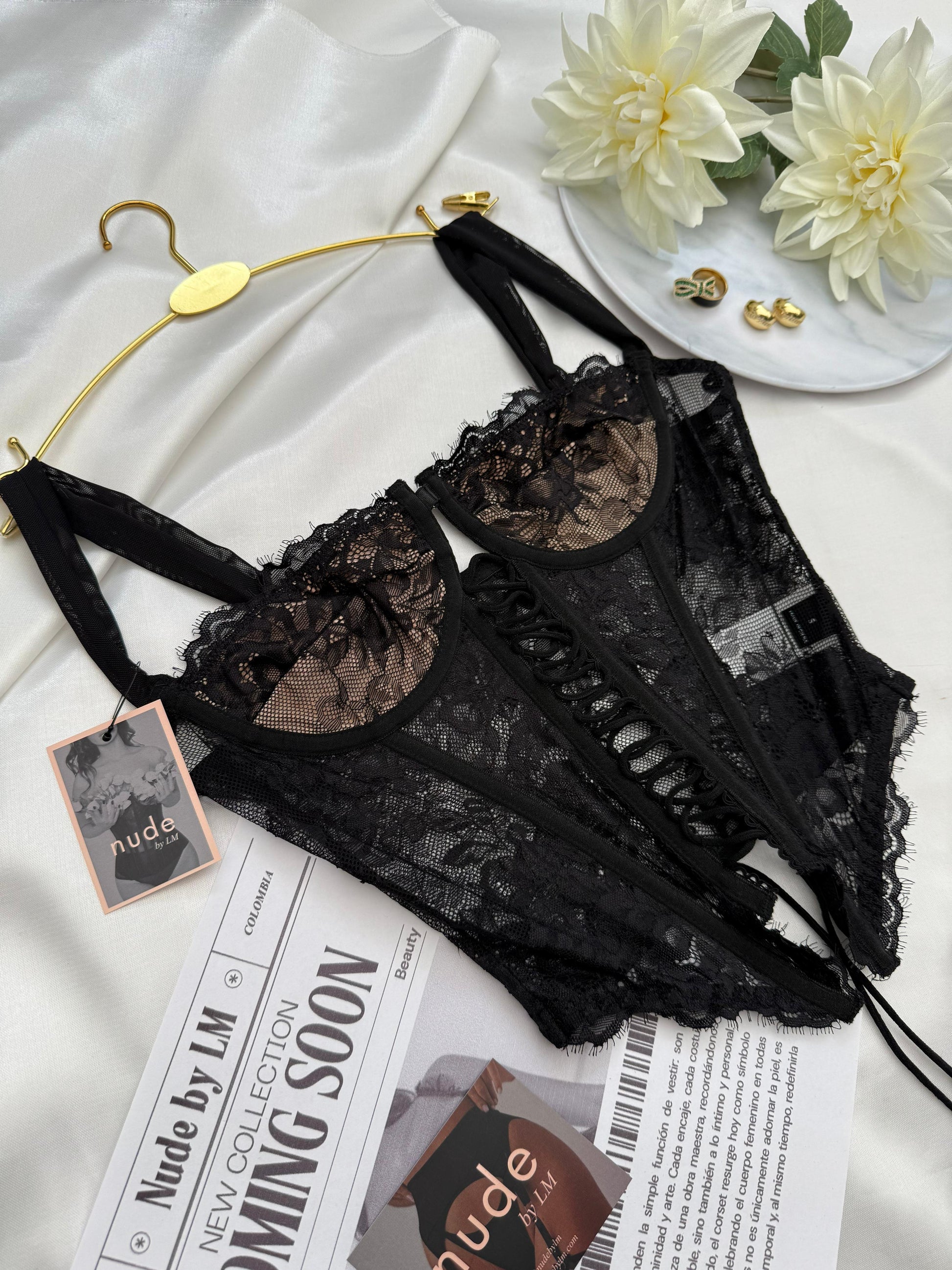Corset en encaje con hombros en tela tipo mesh; con cierre de amarre frontal; cuenta con broche entre las copas para juntar y centrar el busto; copas forradas (No transparentes).