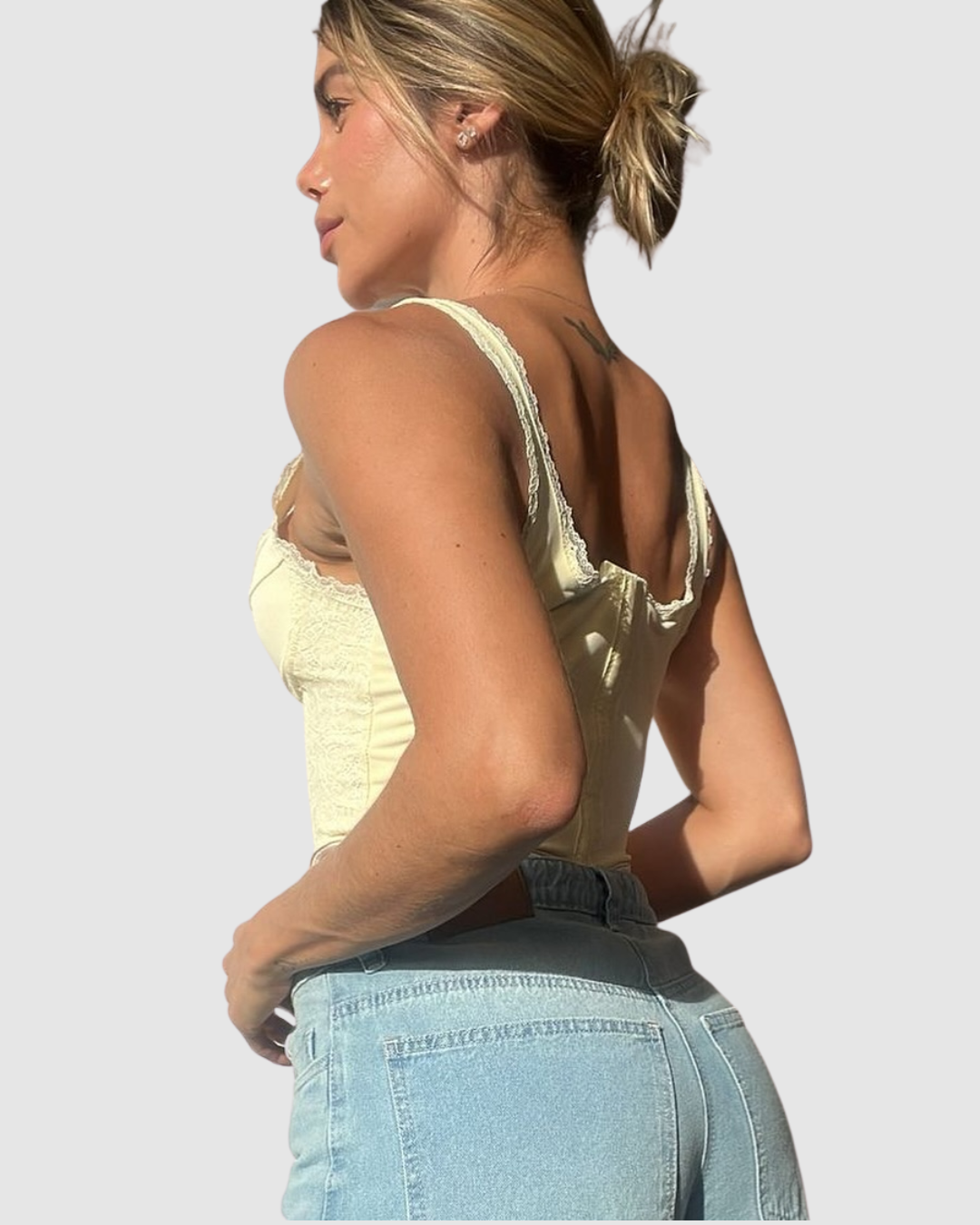 Corset en color pastel con apliques en encaje, copa forrada, estructura favorecedora.
