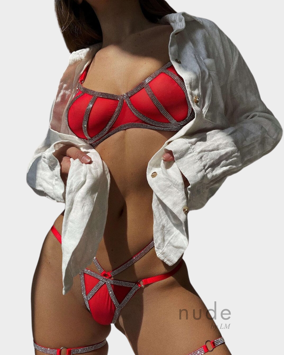 Set de tres piezas en transparencia con aplique de brillos, incluye Bralette con aro para mejor horma y soporte, espalda ajustable. Panty ajustable con refuerzo interno en algodón. Ligas ajustables.