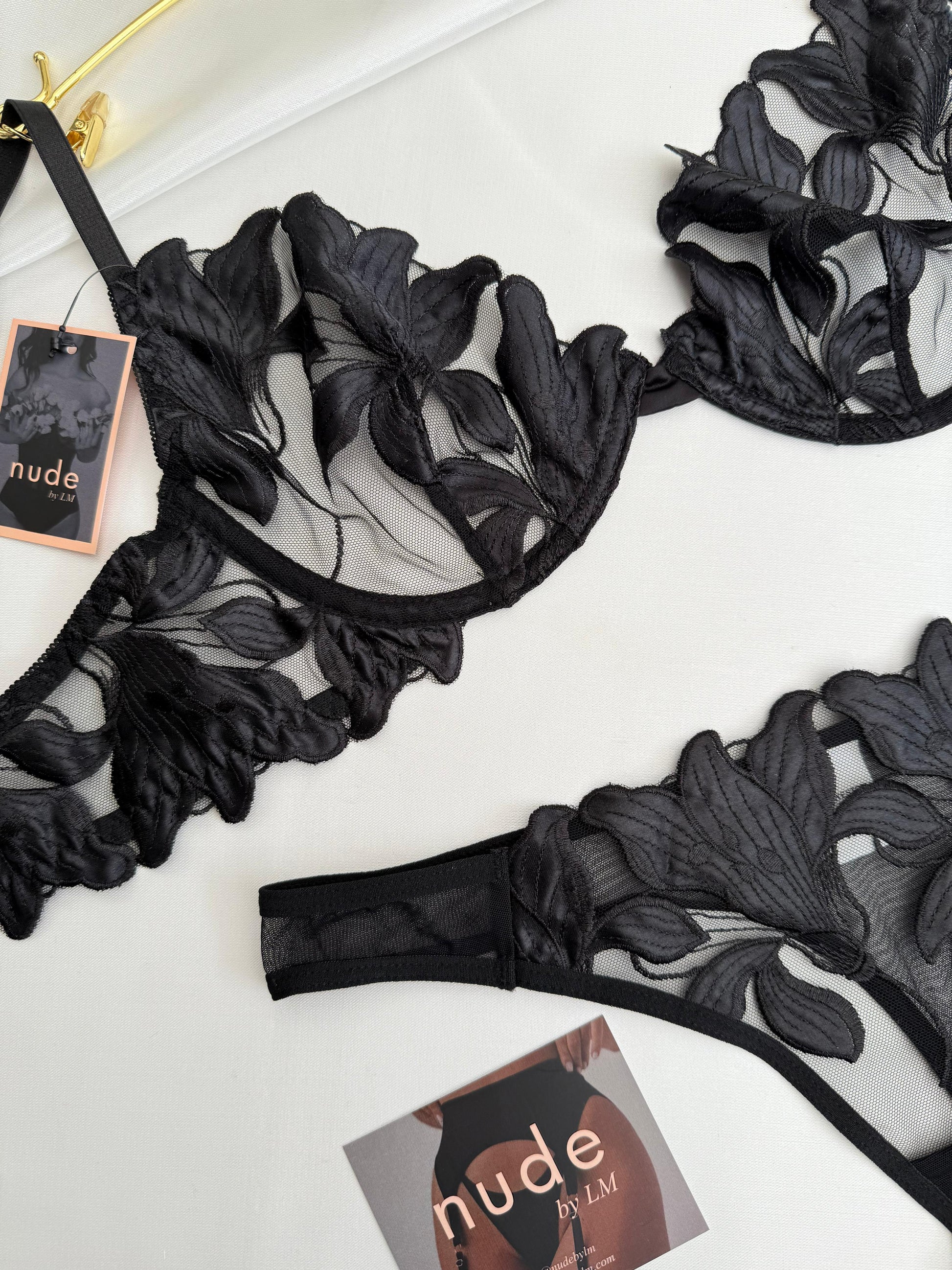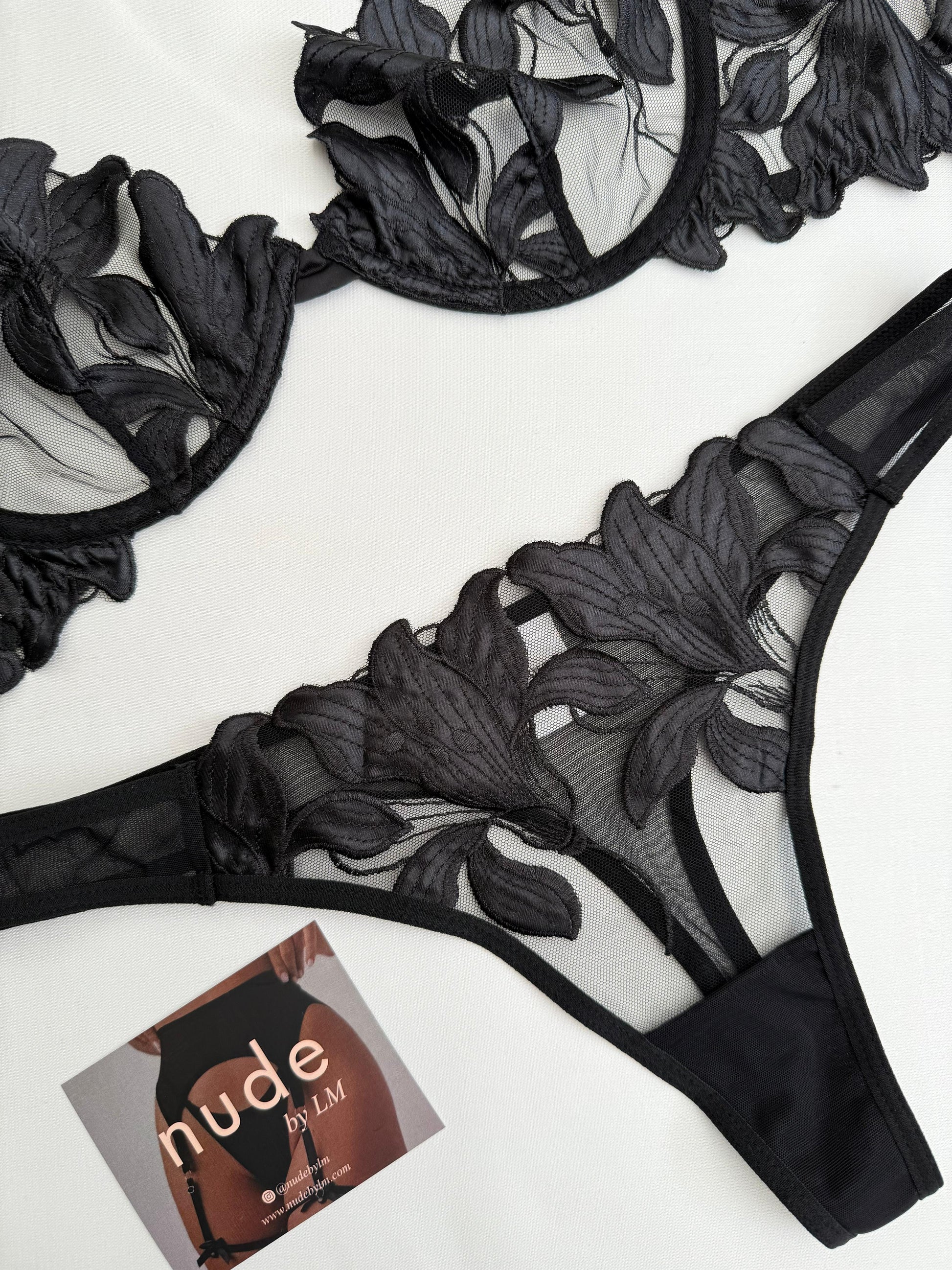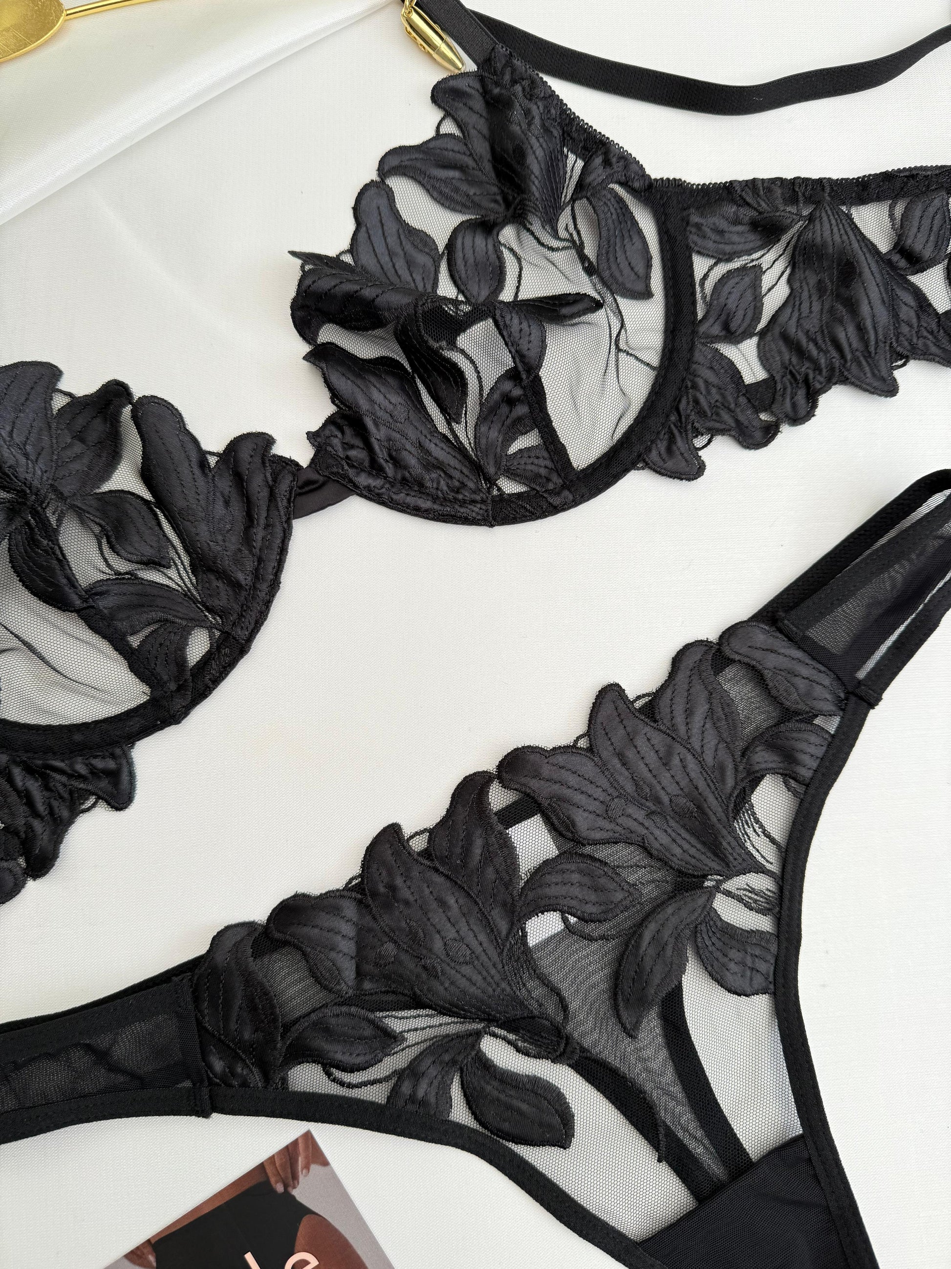 Set de dos piezas en tela con bordado floral; incluye Bralette con aro para mejor horma y soporte y Panty con refuerzo interno en algodón.