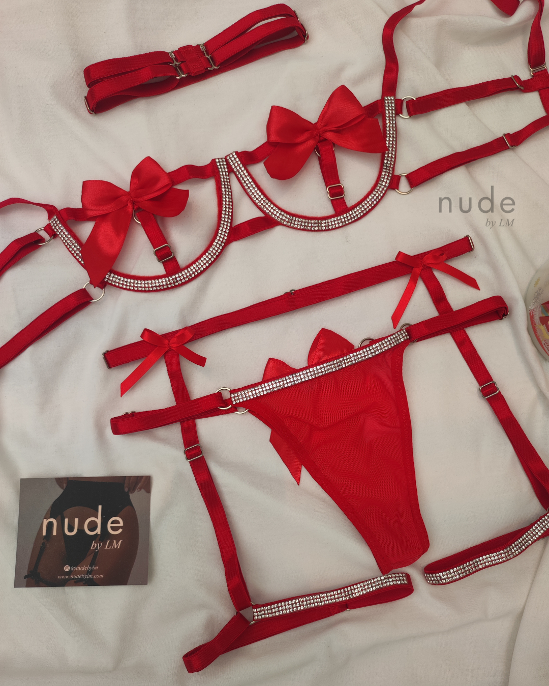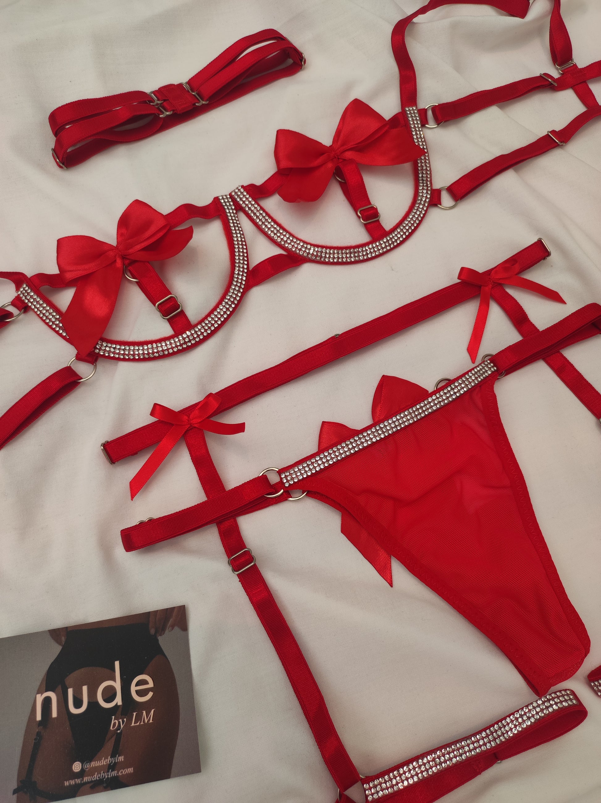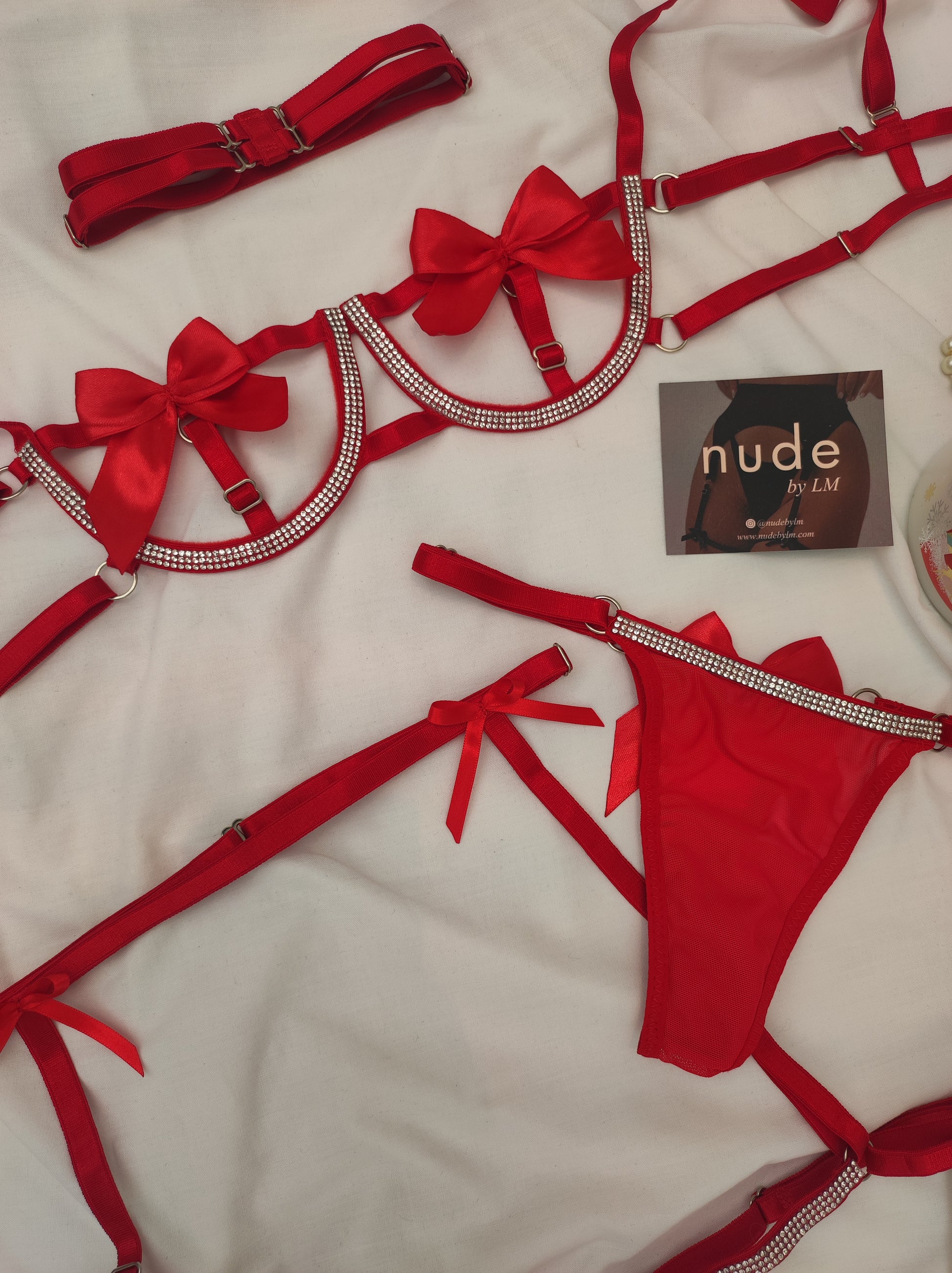 Set de 4 piezas; incluye Bralette con aro para mejor horma y soporte, espalda y copa ajustable; Panty ajustable con refuerzo interno en algodón, Arnés ajustable con ligas incorporadas y Collar ajustable.