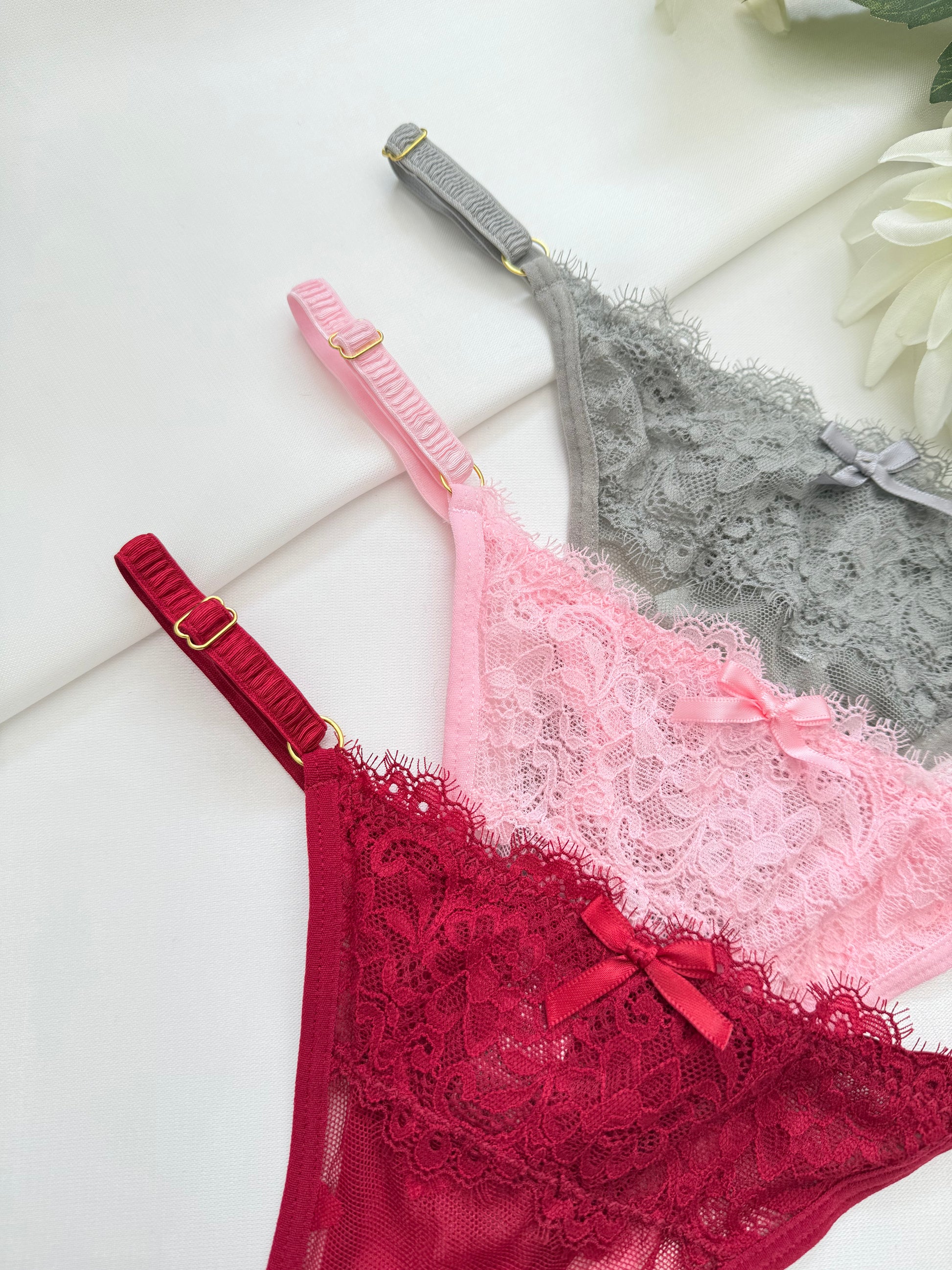 Trío de Pantys en tela con bordado de corazón y aplique de encaje, con laterales ajustables y refuerzo interno en algodón.
